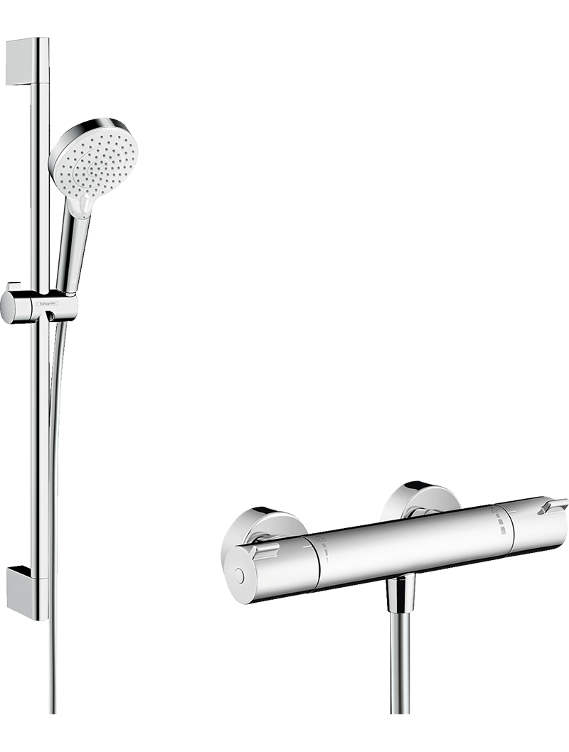 şunları içerir: el duşu, termostatik duş, duş barı, sürgü, duş hortumu duş başlığı ölçüsü: 100 mm sprey tipi tepe duşu Rain, IntenseRainmaksimum akış miktarı (3 bar basınçta): 13,8 l/dk minimum akış basıncı: 1 bar min. çalışma basıncı: 1 bar maks. çalışma basıncı: 6 bar sprey türü ayarı döner sprey diski ile termostat Ecostat 1001 CLboru profili: round duş barı çapı: 22 mm boru uzunluğu: 669 mm plastik duvar desteklerihortum bükülmelerine karşı hareketli bağlantı90° pozisyonda ayarlanabilir el duşu askısı, sağa ve sola, yukarı ve aşağı dönebilir