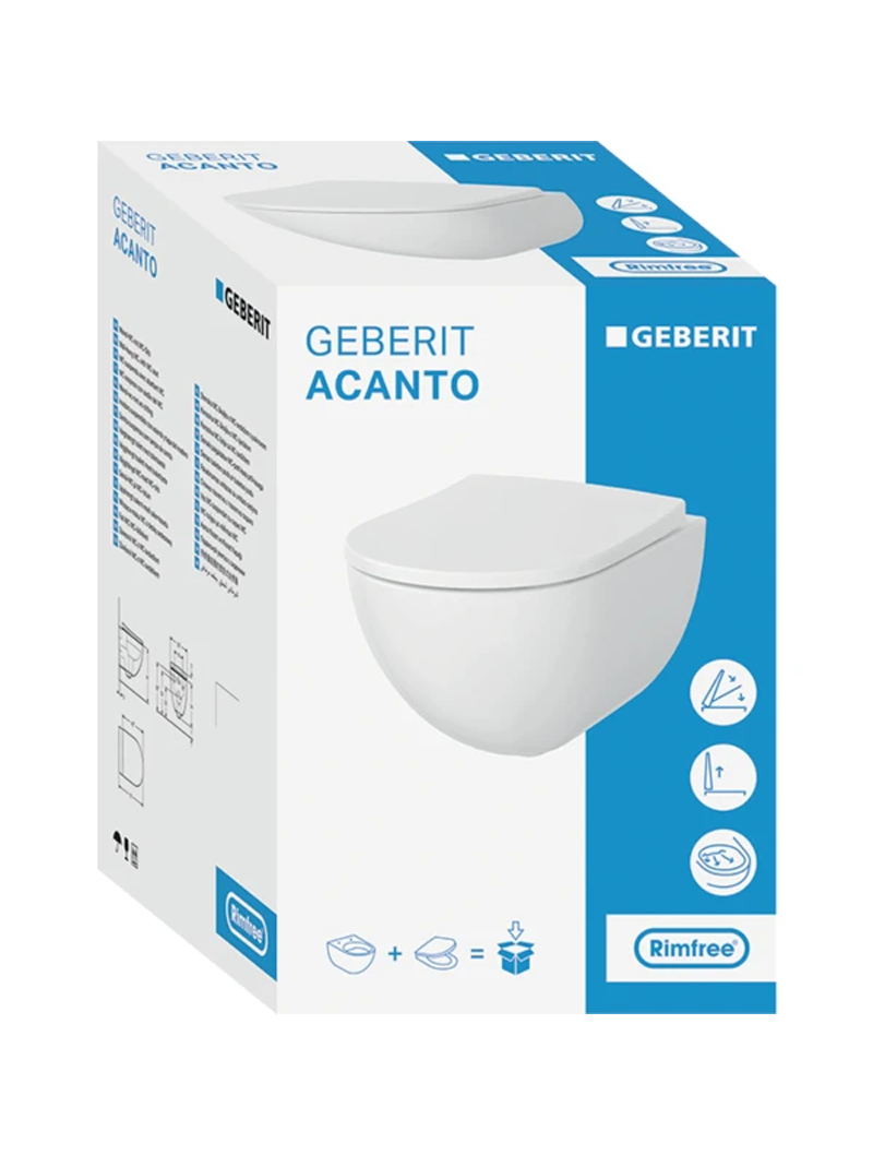 Geberit Acanto taharet fonksiyonlu alçak tip asma klozet seti, kapalı form, Rimfree, klozet kapaklı, örtüşen kapak