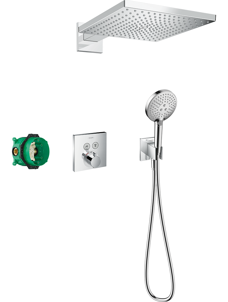 şunları içerir: tepe duşu, el duşu, Termostat, iç set, duş çıkışı, duş hortumu duş başlığı ölçüsü: 300 x 300 mm sprey tipi tepe duşu RainAirel duşu sprey tipi: PowderRain, Rain, Whirl maksimum akış miktarı (3 bar basınçta): 17,1 l/dk minimum akış basıncı: 1,5 bar min. çalışma basıncı: 1,5 bar maks. çalışma basıncı: 6 bar termostat ShowerSelecthortum bükülmelerine karşı hareketli bağlantıbağlantı türü: iç set çıkışların kullanımı: birçok çıkışın eş zamanlı kullanımı