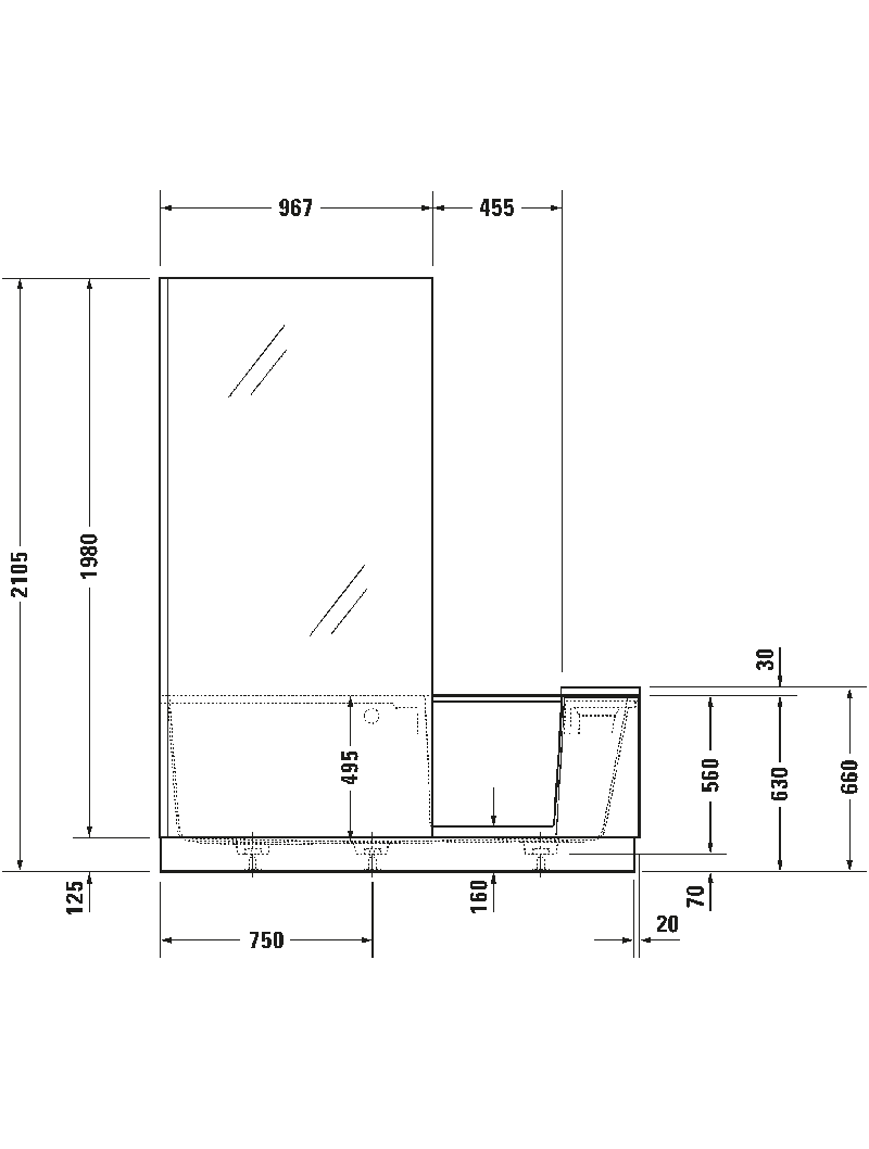 Shower + Bath, Dikdörtgen, Montaj türü: Sol köş, Mineral döküm kaplama ve destek ayağı, Beyaz Mat, Mineral döküm, DuroCast Plus, Duş kabini konumu: Sol, Sırt dayama yeri sayısı: 1 Sağ, Çıkarılabilir giriş paneli:, Destek ayak dahil, Su taşma deliği: Evet, Sifon konumu: Orta, Önde, Su taşma deliği konumu: Orta, Net kapasite: 285 l, İç derinlik: 495 mm, Küvet paneliyle beraber yükseklik: 660 mm, Duş kabini yüksekliği: 2105 mm