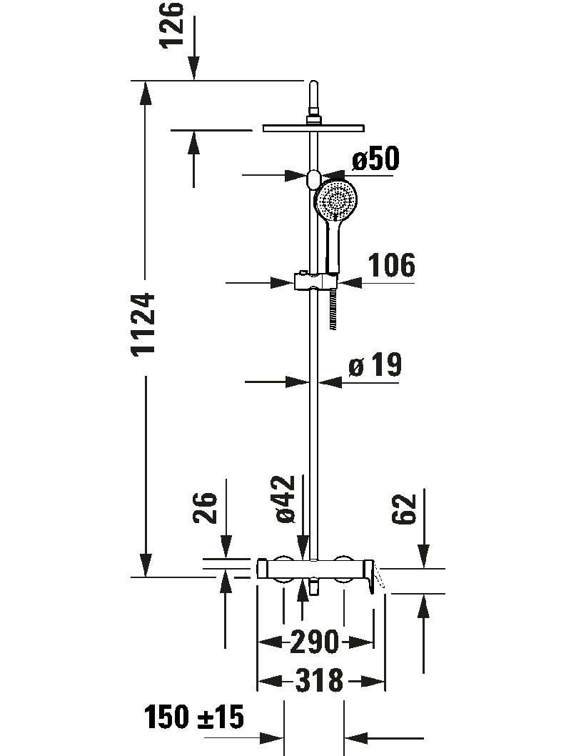 Duş bataryası, yüksekliği ayarlanabilir el duşu askısı: yüksekliği ayarlanabilir, Duş hortumu dahil, Duş hortumu uzunluğu: 1600 mm, El duşu dahil, Tepe duşu dahil, Tepe duşu açısı ayarlanabilir, Su bağlantısı ölçüleri: DN 15, Su şebekesi bağlantı türü: S-Bağlantıları, Hortum bağlantısı ölçüleri: 1/2 inç, Seramik kartuş, önerilen çalışma basıncı: 1 – 5 bar, Tek yönlü vana Hortum bağlantısında, Merkezler arası mesafe: 150 mm ± 15 mm Design by DuravitKrom Parlak, Yükseklik: 1124 mm, El duşu akış hızı (3 bar): 14,5 l/min, Tepe duşu akıış hızı (3 bar): 18,5 l/min WA4280007010